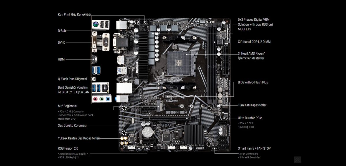 GIGABYTE B550M S2H 5000MHz(OC) DDR4 Soket AM4 M.2 HDMI DVI VGA mATX Anakart