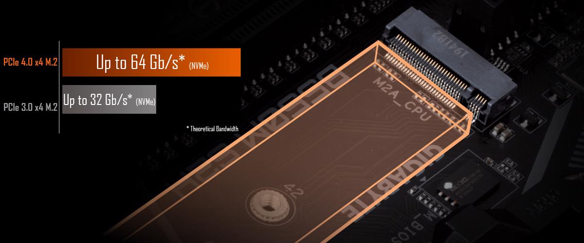 Yerleşik NVMe PCIe 4.0*/3.0 x4 M.2 konektörü ile GIGABYTE Anakartları, kullanıcılara 64 Gb/sn-ye kadar veri aktarım hızı sunarak NVMe modu veya SATA modu bağlantısı deneyimi sunar.