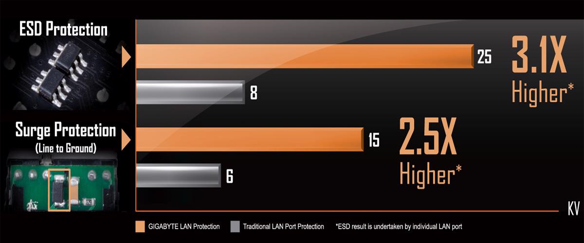 GIGABYTE anakartları, geleneksel IC-lere kıyasla ESD direnç seviyelerinin 3 katına kadar IC-ler kullanır. Bu, anakartı ve bileşenlerini statik elektriğin neden olduğu olası hasara karşı daha iyi korumaya yardımcı olur. GIGABYTE anakartları ayrıca anakartınızı ve PC-nizi güç dağıtımında meydana gelebilecek herhangi bir dalgalanmadan koruyan ve PC-nizin olası herhangi bir düzensiz ve tutarsız güç dağıtımıyla başa çıkmak için donatılmasına yardımcı olan özel anti-dalgalanma IC-lerine sahiptir.