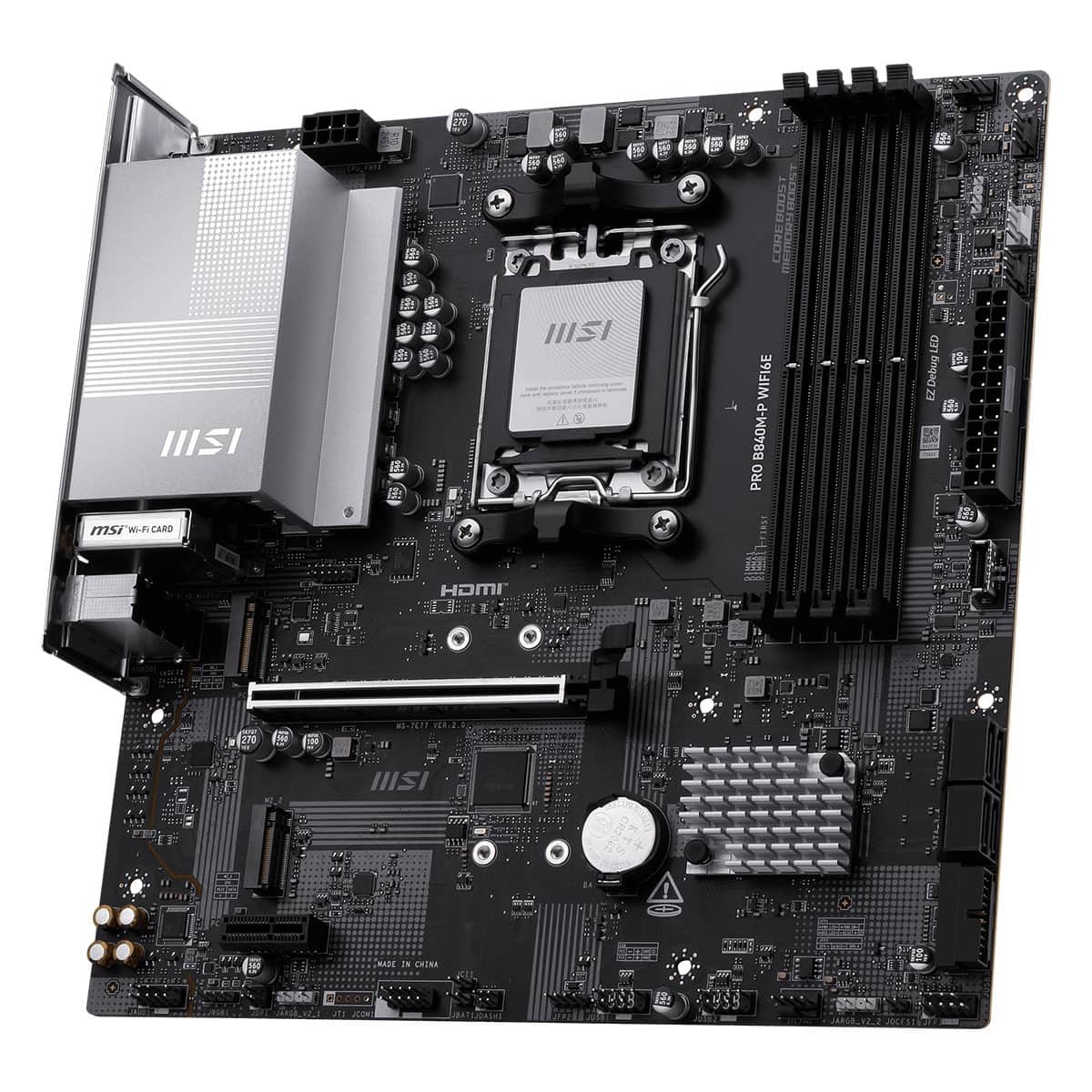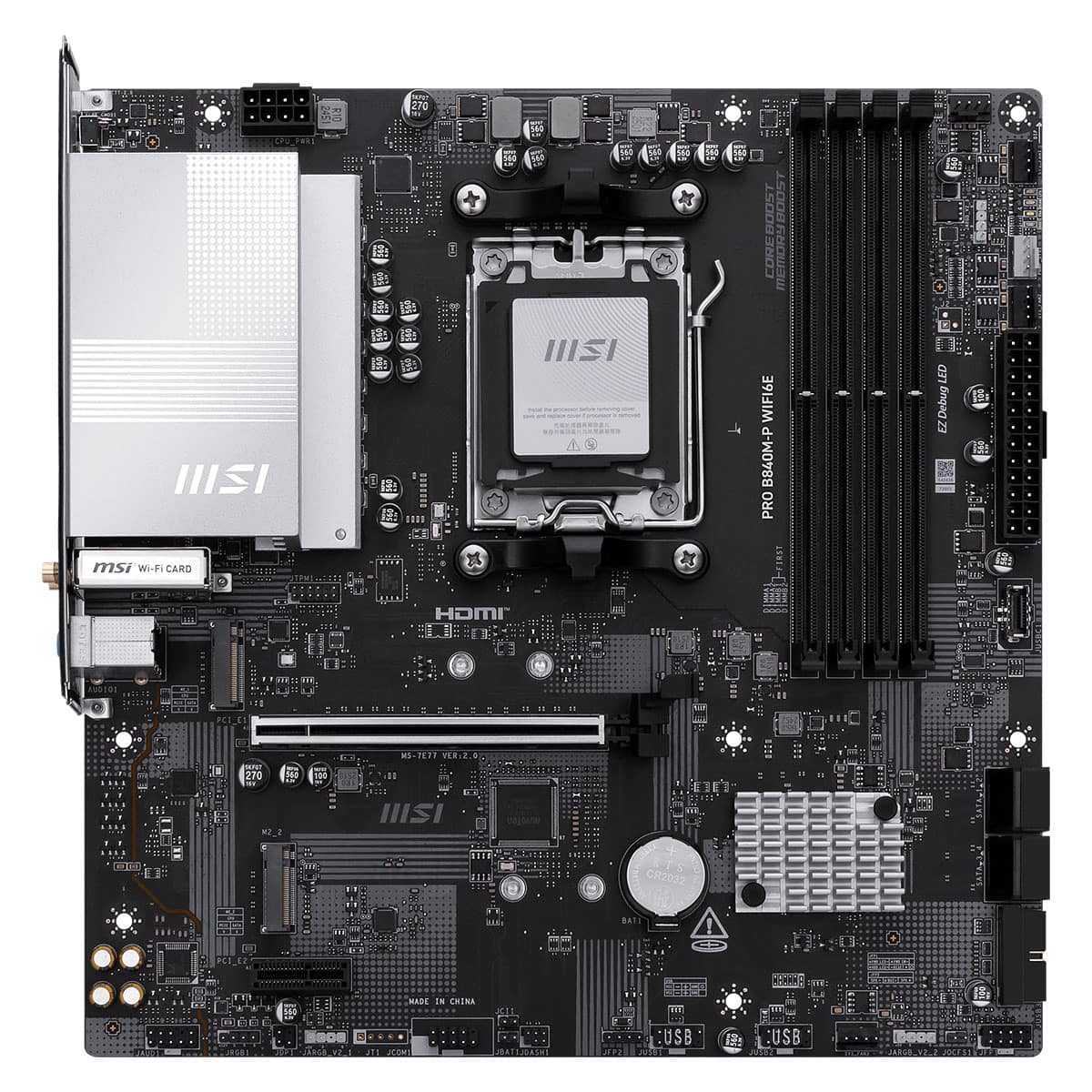 PRO B840M-P WIFI6E, AMD Ryzen 9000 / 8000 / 7000 serisi masaüstü işlemcileri destekleyen en yeni AMD B840 yonga setine sahip, PCIe 4.0, 2.5G LAN, Wi-Fi 6E, DDR5 ve Frozr tasarımına sahip, iş odaklı bir mATX anakarttır.