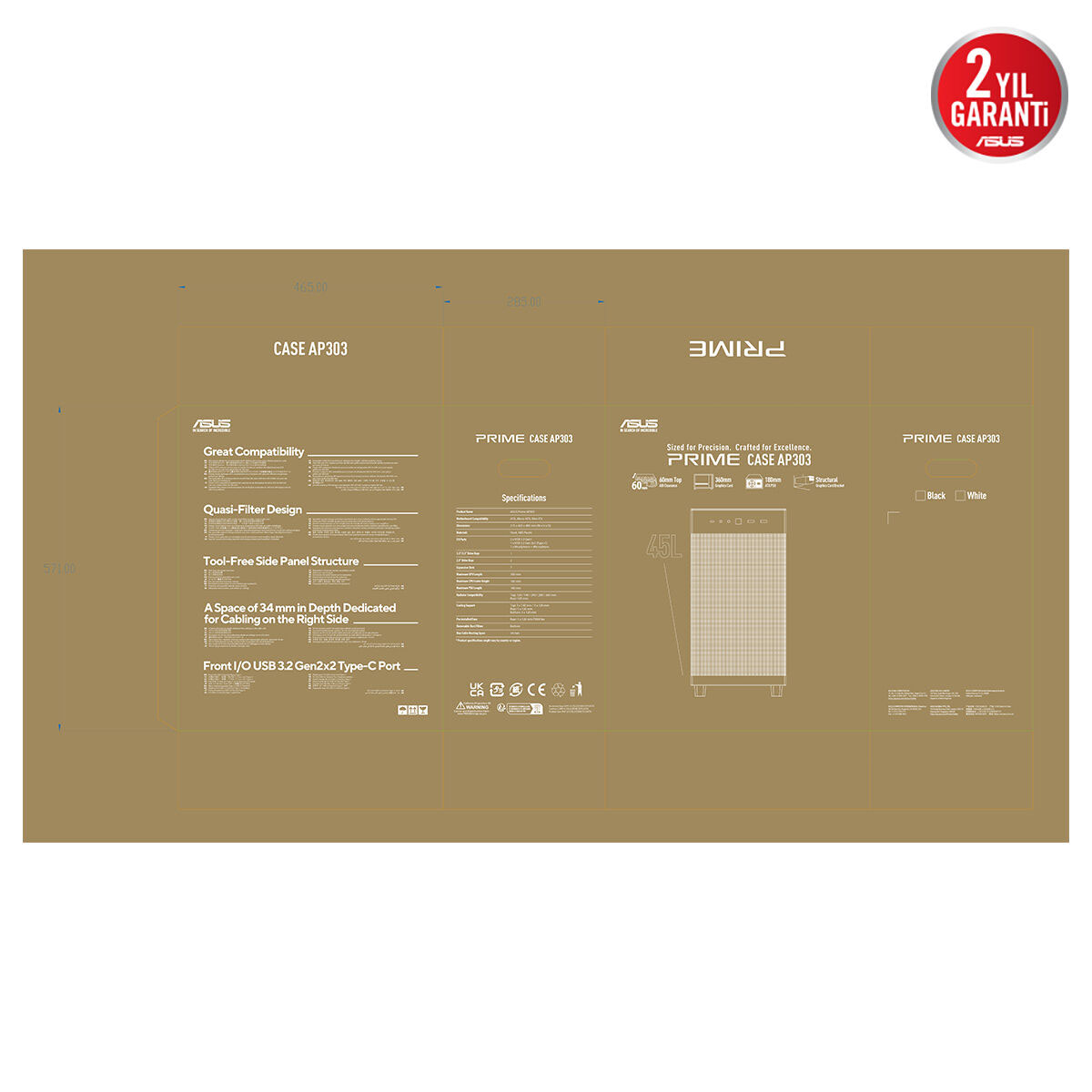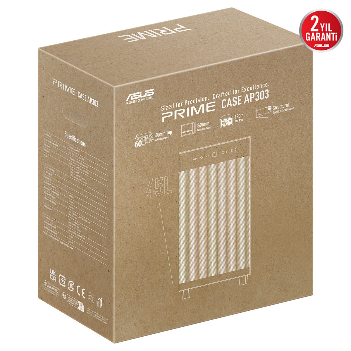 ASUS Prime AP303, 360mm uzunluğundaki ekran kartlarına, 60mm kalınlığa kadar 360mm radyatörlere ve 180mm uzunluğundaki ATX PSU’lara destek veren 44 litrelik kompakt bir ATX kasadır.