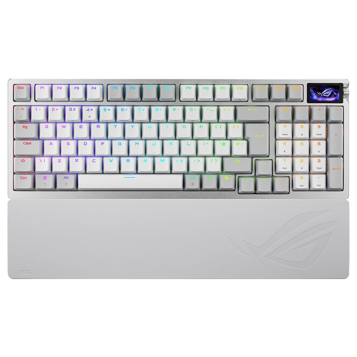 ROG Azoth 96 HE analog oyuncu klavyesi, hızlıca değiştirilebilen ROG HFX V2 manyetik anahtarlar ve ROG Hall Sensörü, OLED ekran, üç yönlü kontrol tekerleği, ROG SpeedNova 8K kablosuz teknolojisi ile üç modlu bağlantı, Zone modu, altı katmanlı sönümleyici ve çıkarılabilir silikon bilek desteği