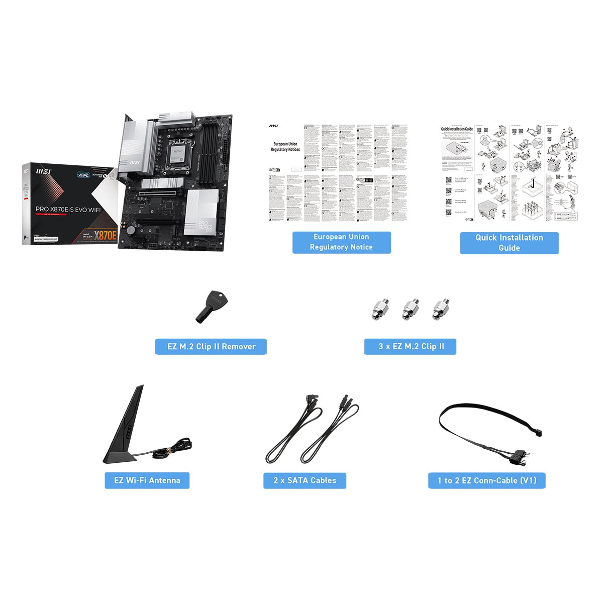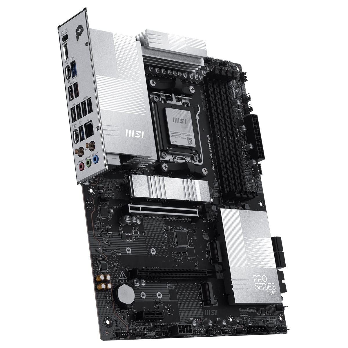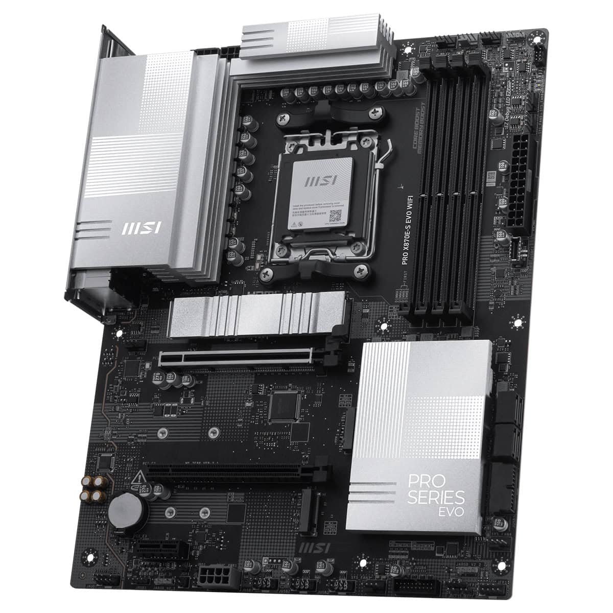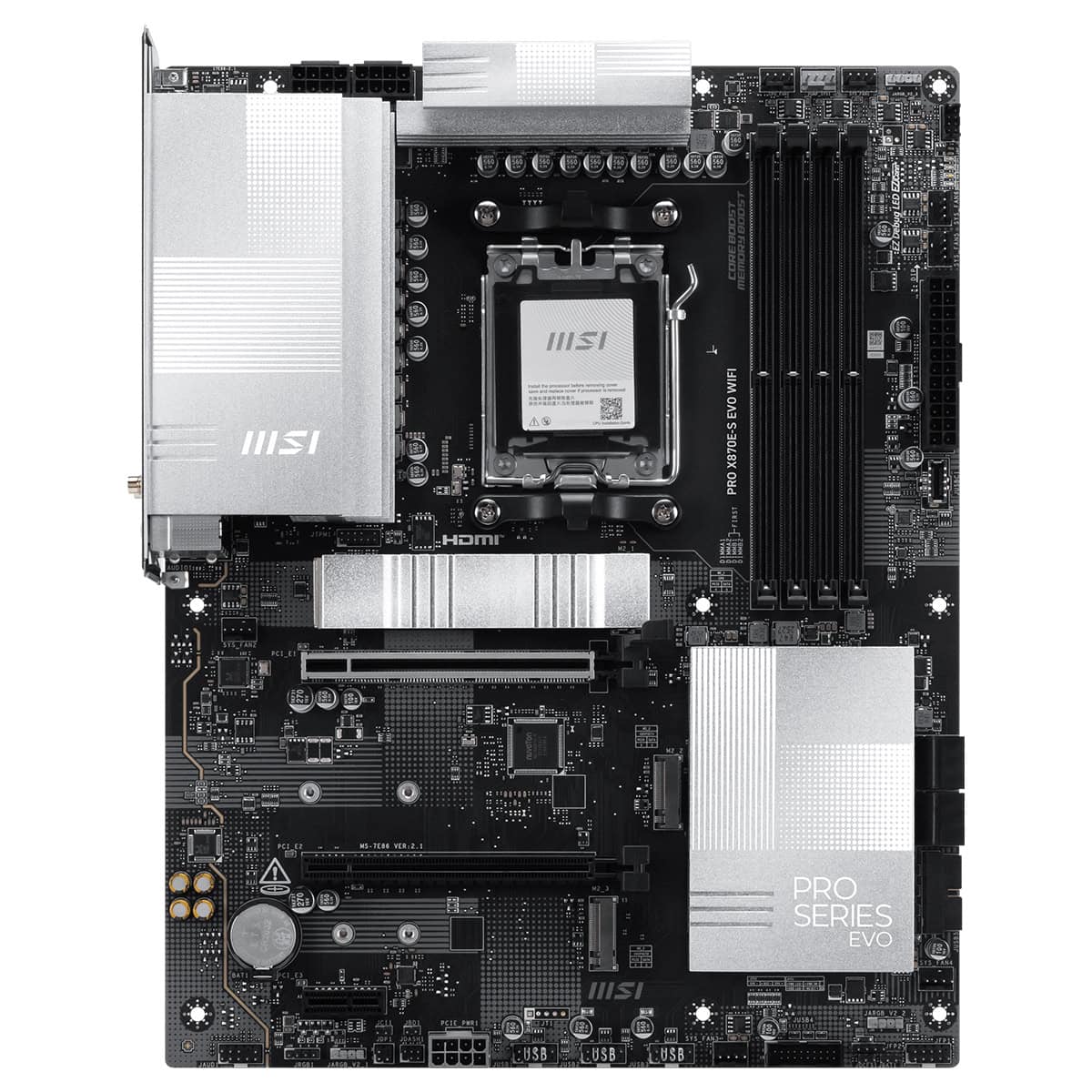 PRO X870E-S EVO WIFI, 12Duet Rail güç sistemi ve en yeni AMD 870E yongasetine sahip tasarım odaklı bir ATX anakarttır. AMD Ryzen 9000 / 8000 / 7000 serisi masaüstü işlemcilere destek verir. PCIe 5.0, 5G LAN, Wi-Fi 7, DDR5 ve Frozr tasarımı ile hem yenilikçi, hem de en üstün teknolojilere sahip donanımları destekler.