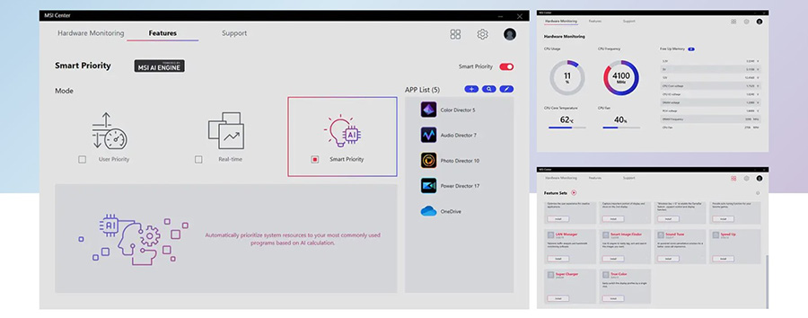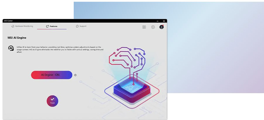 MSI AI Engine kullanım senaryosunu algılar ve performans, ses efektleri ve görüntü modunu en uygun şekilde otomatik olarak değiştirerek kullanıcının müdahale gereksinimini ortadan kaldırır.